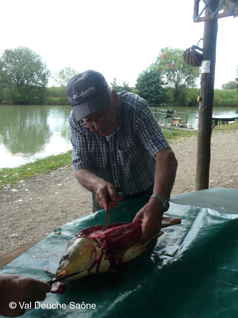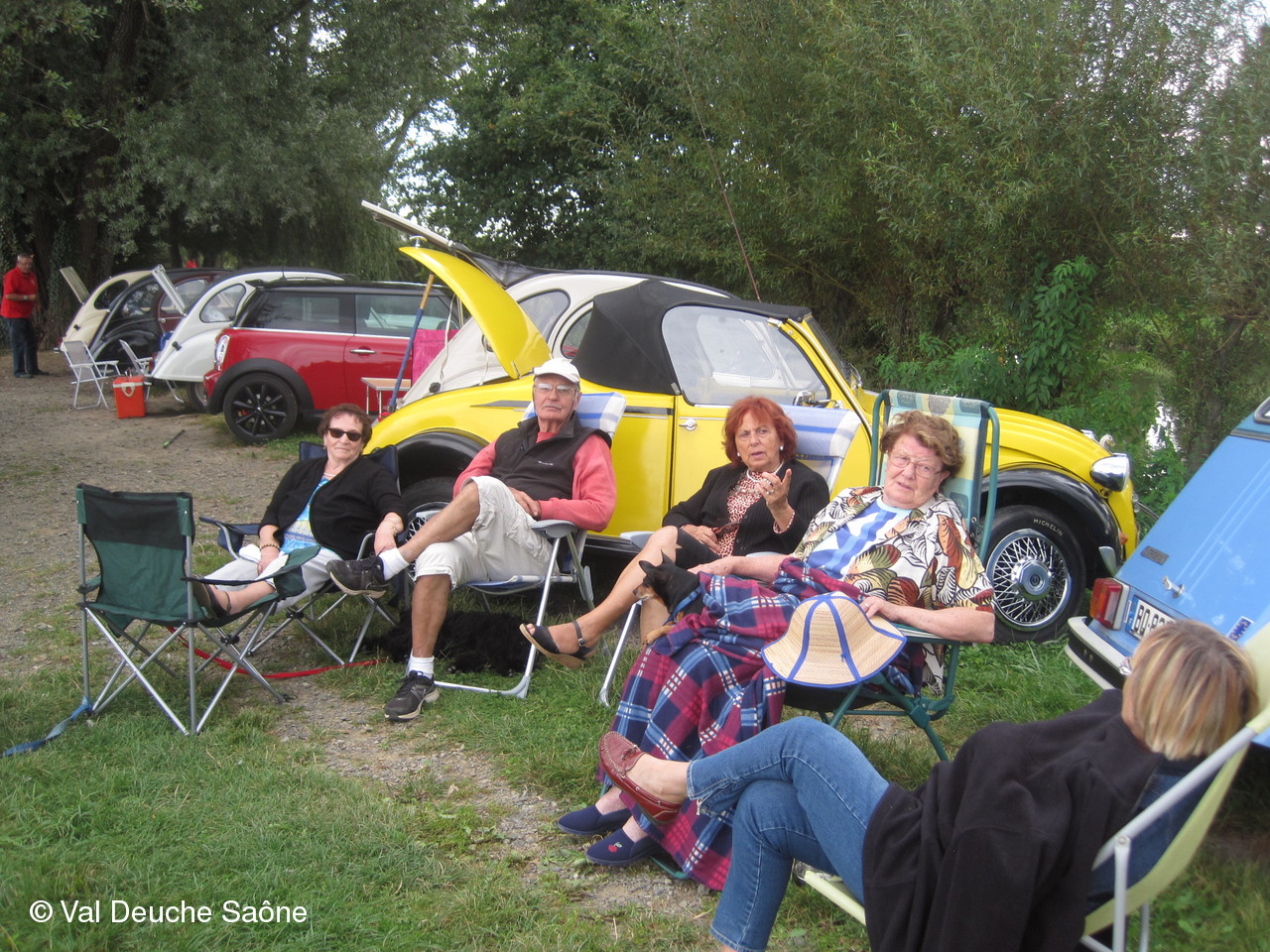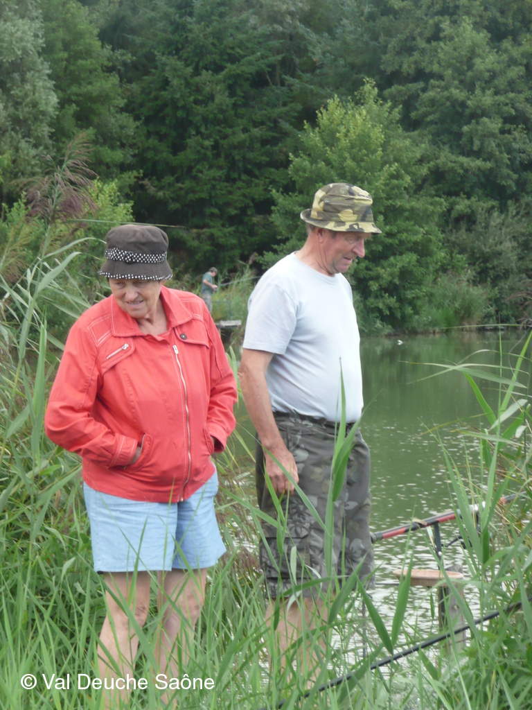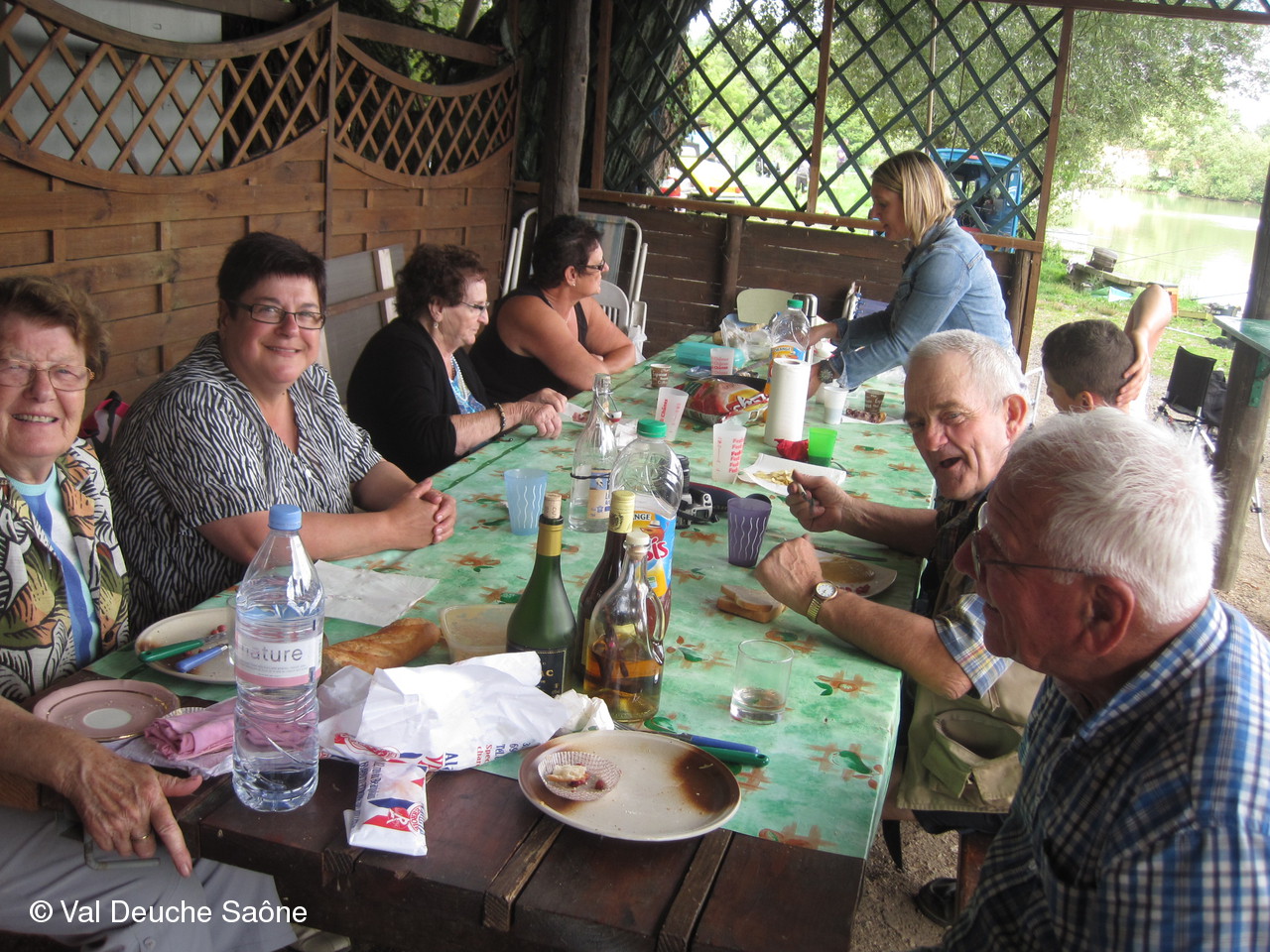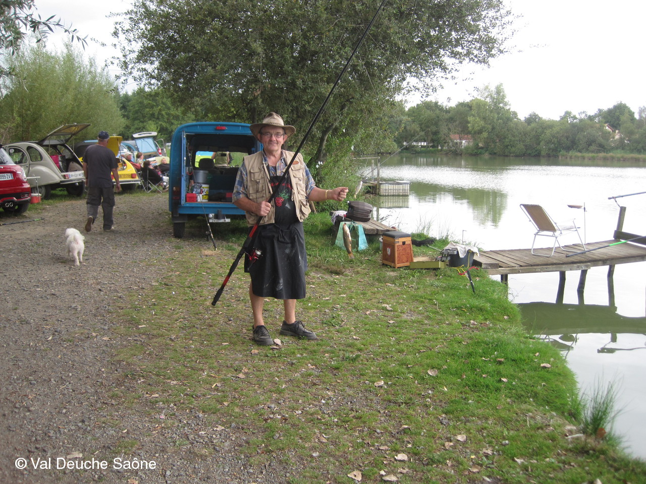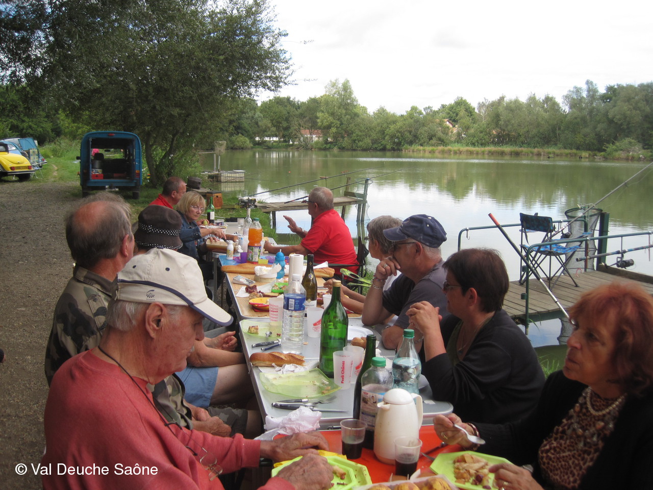 En cette dernière journée du mois d'août, une vingtaine d'adhérents se sont retrouvés au bord de l'étang de Sainte-Olive (Dombes); 10 véhicules, dont 8 2 CV, à l'invitation de René et Hélène que nous remercions. Malgré un soleil timide, tout le monde a profité "à fond" de cette journée cool dans la bonne humeur : repas agréable au bord de l'étang, sieste, pétanque, pêche acharnée. La famille des adhérents était la bienvenue : enfants, petits-enfants, belle-mère...de nombreux chiens ont également profité de cette belle journée. Une mention particulière pour le fils de Philippe qui a pêché le plus gros poisson : une "carpe cuir" de 67 cm, pesant 5,5 kg et qui a souhaité en faire profiter tous ceux qui voulaient y goûter; dans le rôle de traiteur notre ami René, bien sûr. Nous ne parlerons pas de tous les soucis mécanique de notre trésorier, Gérard, mais qui est resté tout de même optimiste, comme à l'habitude...Il était satisfait de sa pêche.