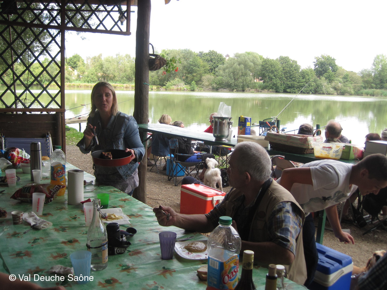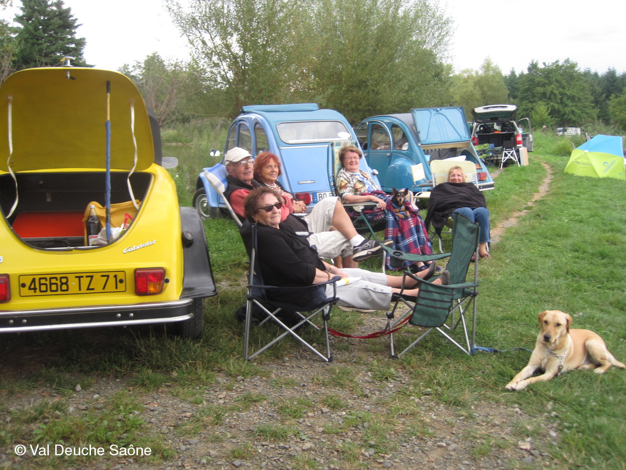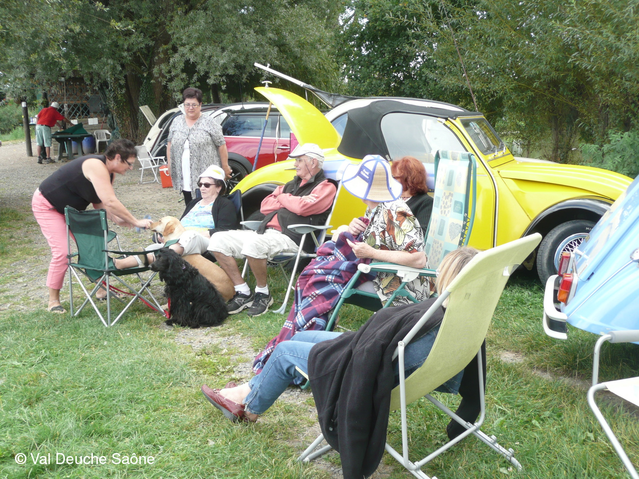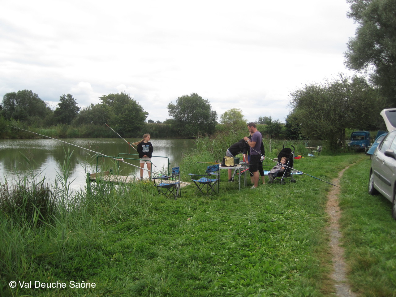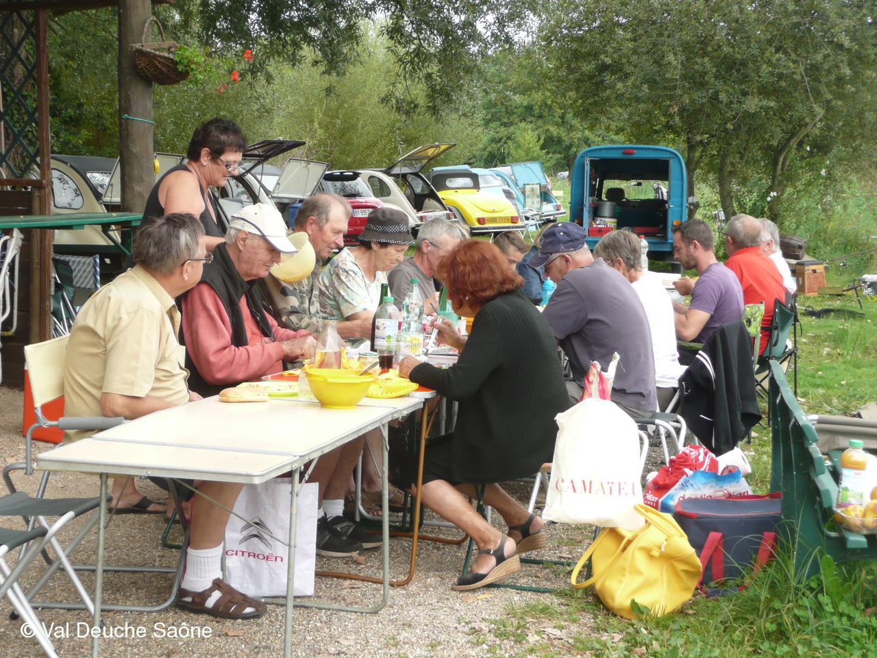 En cette dernière journée du mois d'août, une vingtaine d'adhérents se sont retrouvés au bord de l'étang de Sainte-Olive (Dombes); 10 véhicules, dont 8 2 CV, à l'invitation de René et Hélène que nous remercions. Malgré un soleil timide, tout le monde a profité "à fond" de cette journée cool dans la bonne humeur : repas agréable au bord de l'étang, sieste, pétanque, pêche acharnée. La famille des adhérents était la bienvenue : enfants, petits-enfants, belle-mère...de nombreux chiens ont également profité de cette belle journée. Une mention particulière pour le fils de Philippe qui a pêché le plus gros poisson : une "carpe cuir" de 67 cm, pesant 5,5 kg et qui a souhaité en faire profiter tous ceux qui voulaient y goûter; dans le rôle de traiteur notre ami René, bien sûr. Nous ne parlerons pas de tous les soucis mécanique de notre trésorier, Gérard, mais qui est resté tout de même optimiste, comme à l'habitude...Il était satisfait de sa pêche.