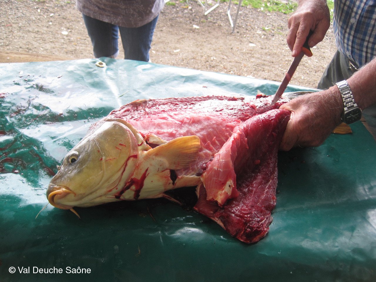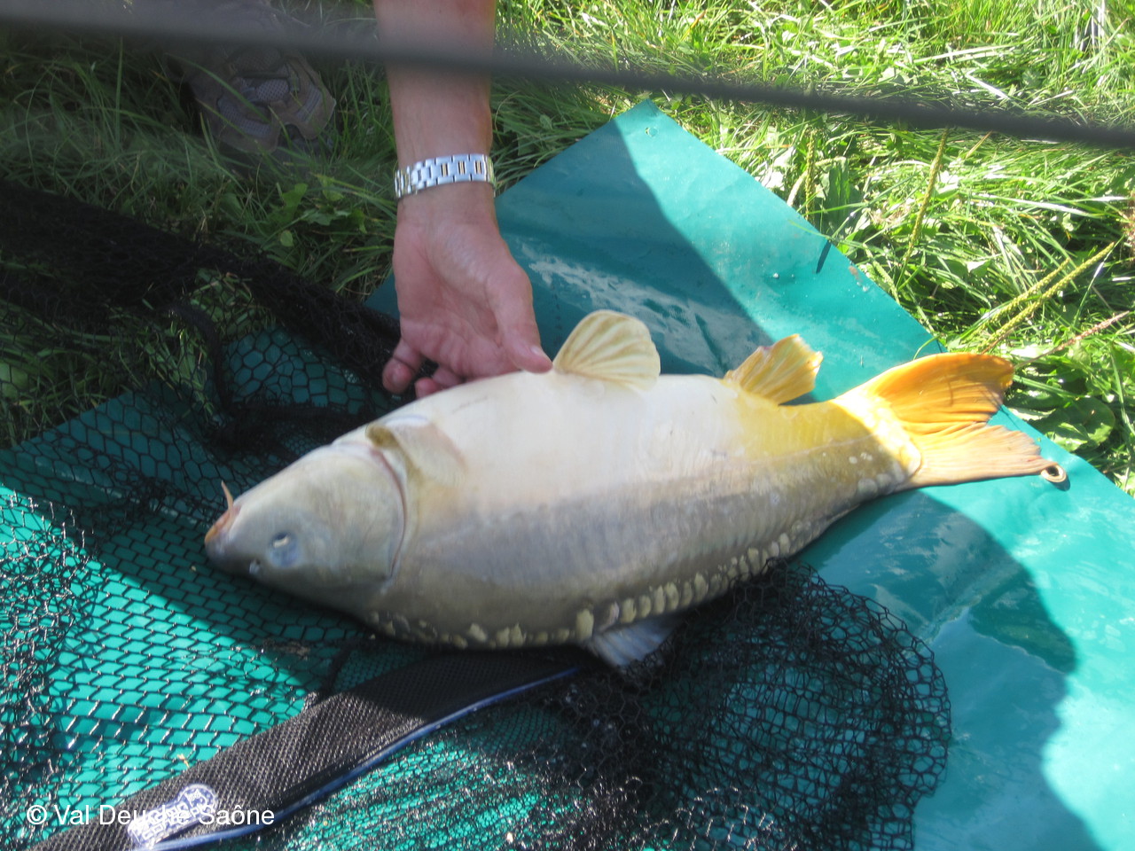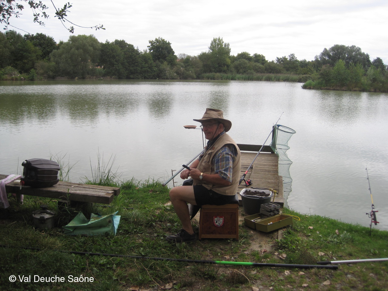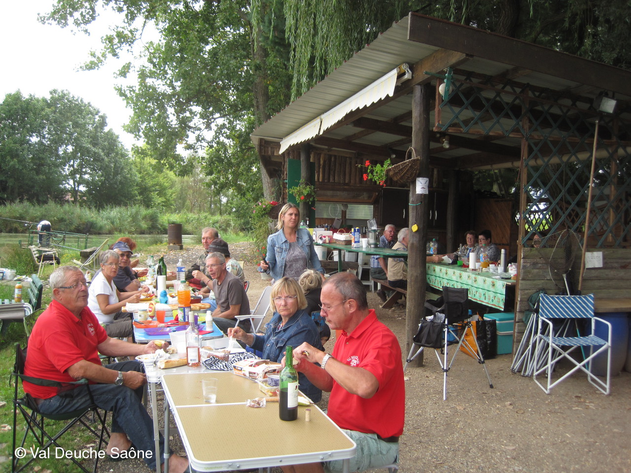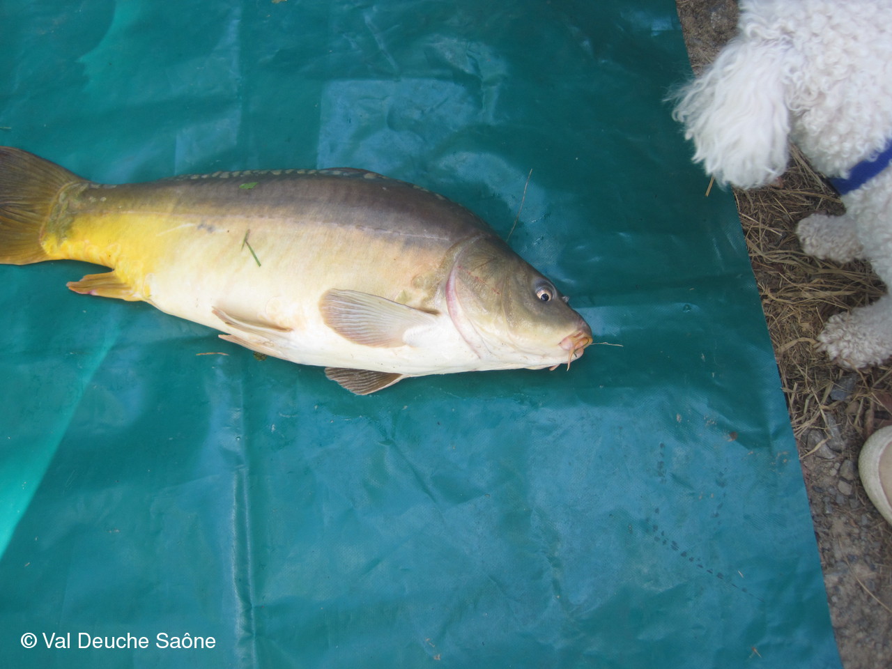 En cette dernière journée du mois d'août, une vingtaine d'adhérents se sont retrouvés au bord de l'étang de Sainte-Olive (Dombes); 10 véhicules, dont 8 2 CV, à l'invitation de René et Hélène que nous remercions. Malgré un soleil timide, tout le monde a profité "à fond" de cette journée cool dans la bonne humeur : repas agréable au bord de l'étang, sieste, pétanque, pêche acharnée. La famille des adhérents était la bienvenue : enfants, petits-enfants, belle-mère...de nombreux chiens ont également profité de cette belle journée. Une mention particulière pour le fils de Philippe qui a pêché le plus gros poisson : une "carpe cuir" de 67 cm, pesant 5,5 kg et qui a souhaité en faire profiter tous ceux qui voulaient y goûter; dans le rôle de traiteur notre ami René, bien sûr. Nous ne parlerons pas de tous les soucis mécanique de notre trésorier, Gérard, mais qui est resté tout de même optimiste, comme à l'habitude...Il était satisfait de sa pêche.