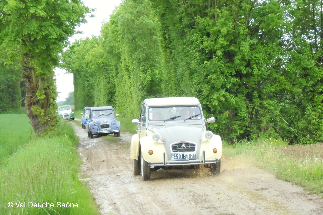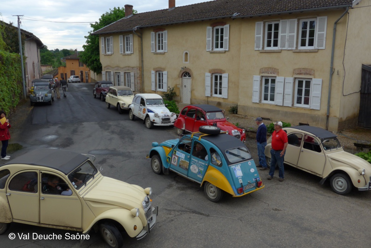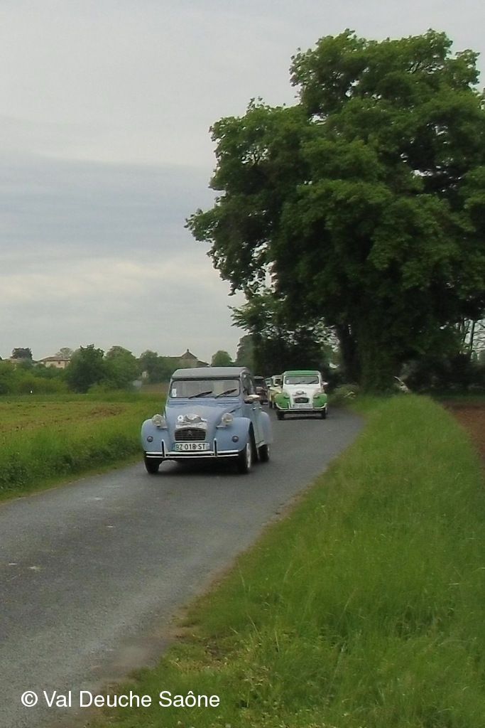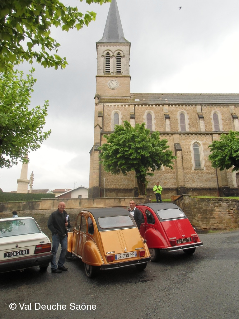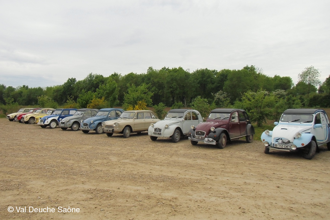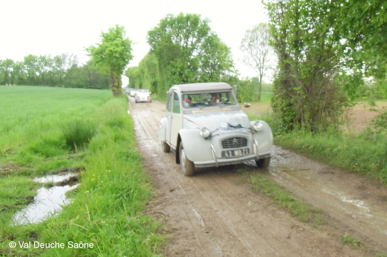 Après le traditionnel café d'accueil, nos 55 équipages venus de Saône et Loire, Bresse, Côte d'Or (6 clubs de 2Cv étaient représentés venant de Dijon, Beaune, Beaujolais, Charolles, Bresse, St Marcel et le Val Deuche) se sont dirigés en direction de la Dombes en passant par St Amour, La Chapelle de Guinchay, St Symphorien d'Ancelles pour franchir le pont de St Romain et arriver à Thoissey. Mais avant, il fallait découvrir la pièce de 2CV qui était cachée dans un sac de sable.