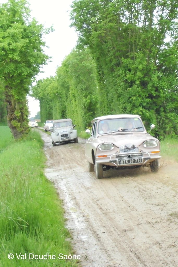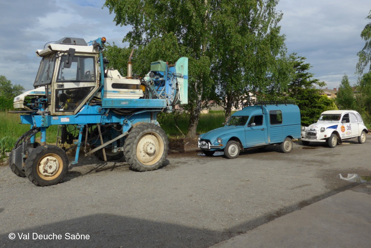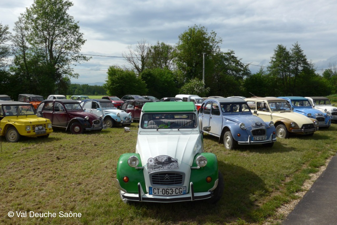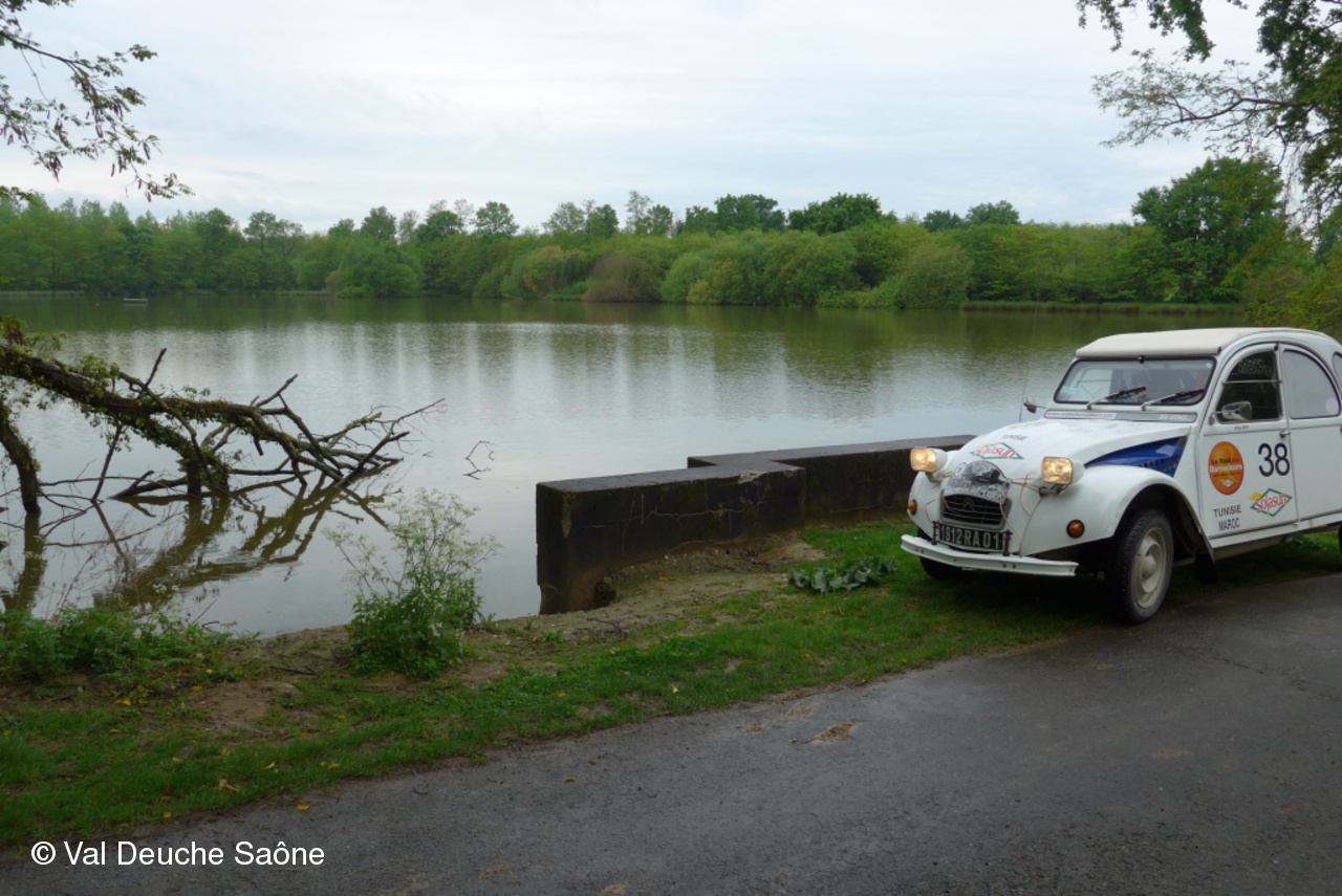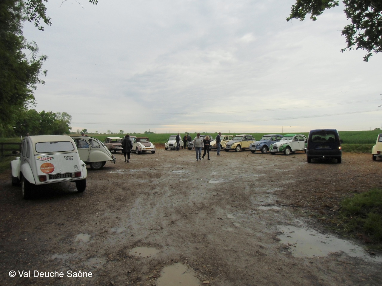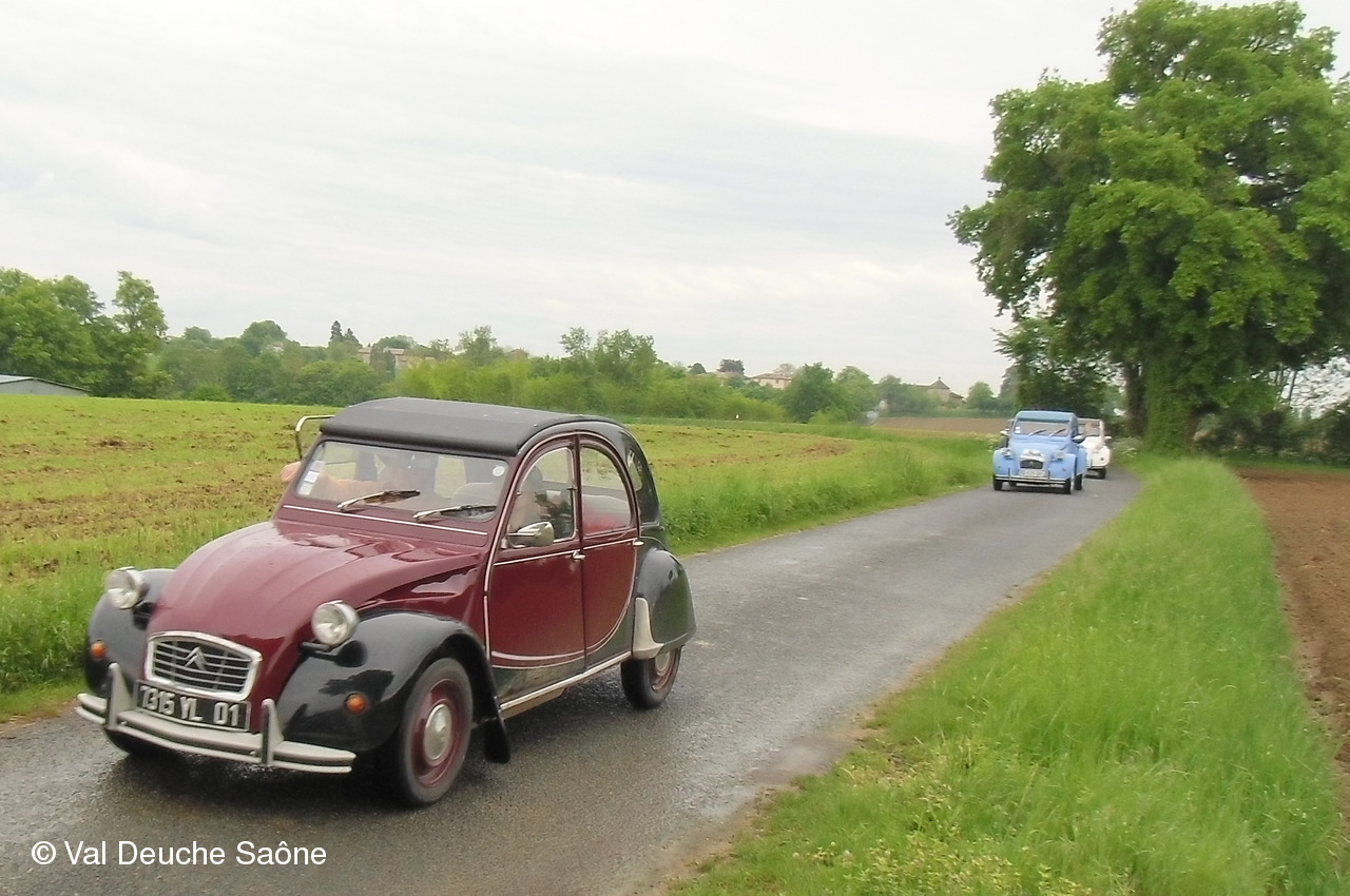 Après le traditionnel café d'accueil, nos 55 équipages venus de Saône et Loire, Bresse, Côte d'Or (6 clubs de 2Cv étaient représentés venant de Dijon, Beaune, Beaujolais, Charolles, Bresse, St Marcel et le Val Deuche) se sont dirigés en direction de la Dombes en passant par St Amour, La Chapelle de Guinchay, St Symphorien d'Ancelles pour franchir le pont de St Romain et arriver à Thoissey. Mais avant, il fallait découvrir la pièce de 2CV qui était cachée dans un sac de sable.